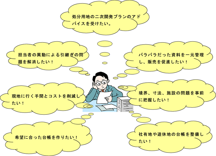 担当者の異動による引継ぎの問題や、施設ごとの膨大なデータの管理、現地の把握など記録はきちんとしていますか? 宅地管理台帳をいったん整備すれば以後の宅地管理効率は格段にアップし、円滑な宅地販売等に効果を発揮します。